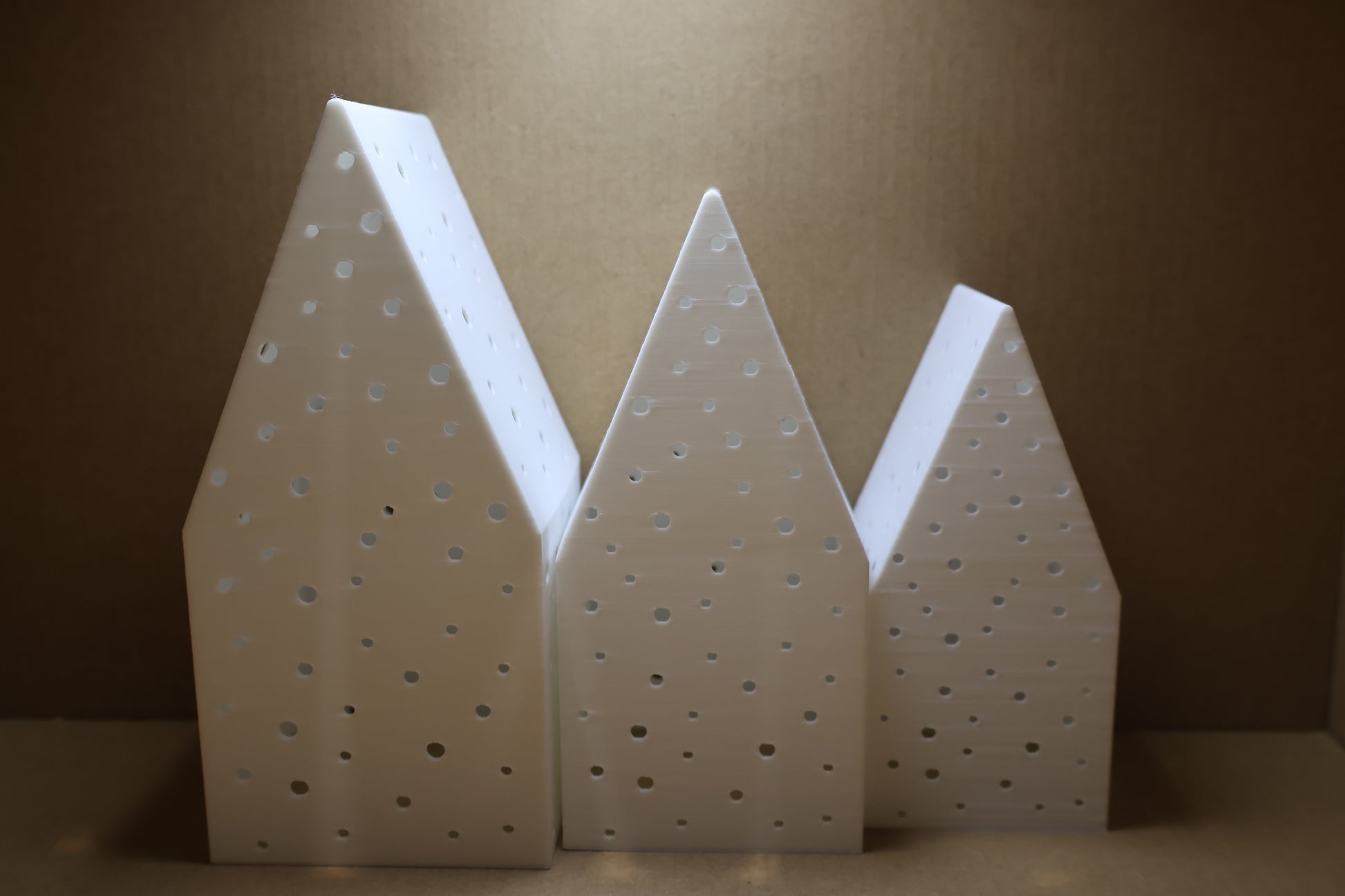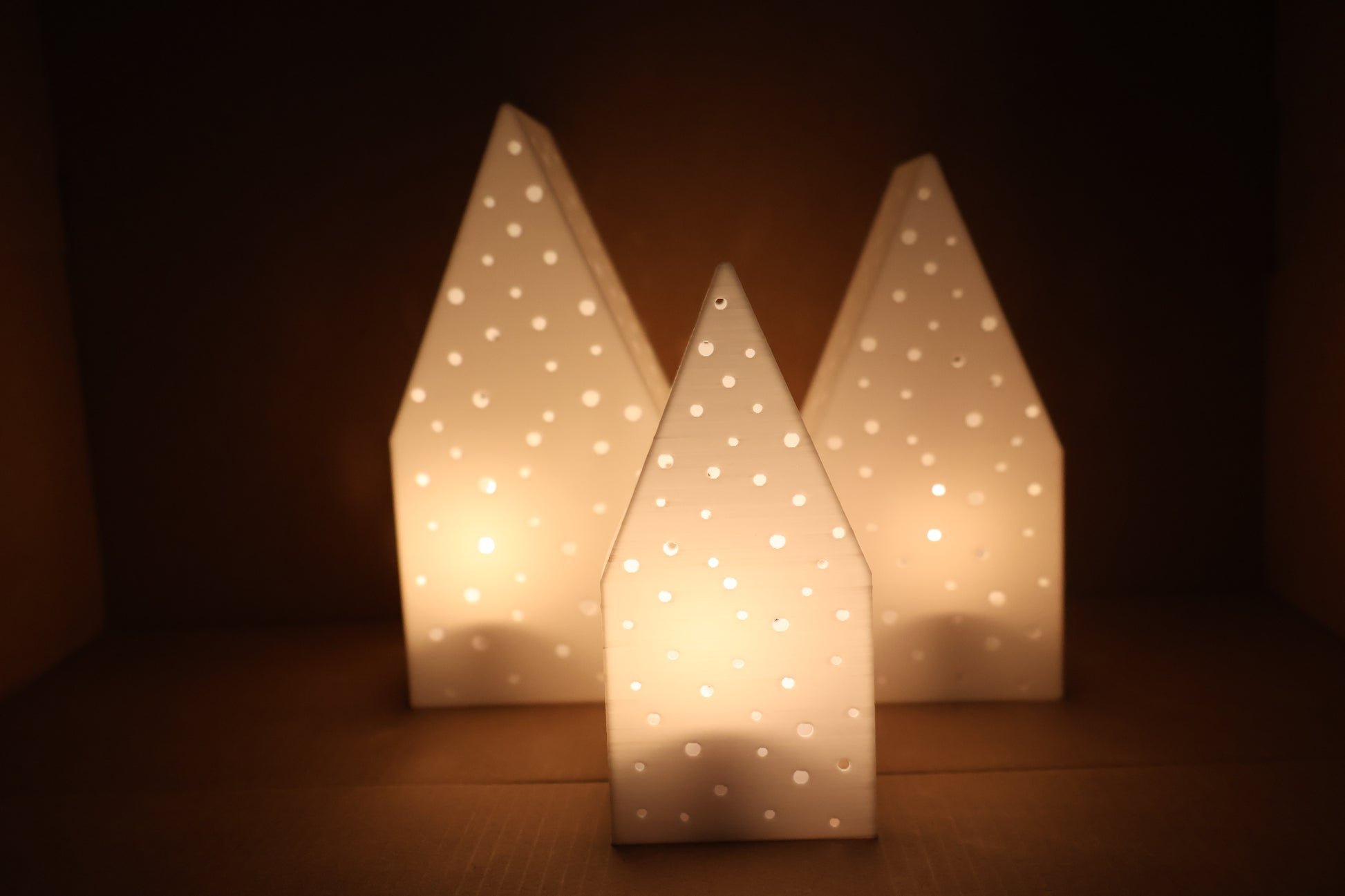 Skab en varm og indbydende julestemning med disse smukke lysende julehuse. De elegante huse har et enkelt, nordisk design med små, huller, der lader lyset skinne blødt igennem og sprede et roligt, hyggeligt skær.